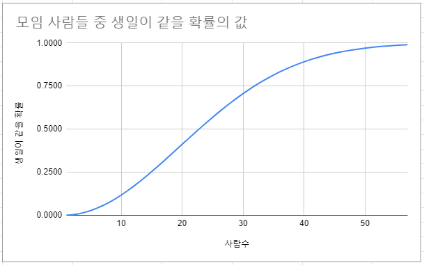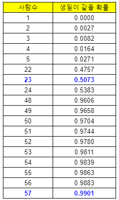 계산을 해보면, 23명 이상 일 때 부터 50%가 넘어가고, 57명이 넘어가면 99%가 넘어간다.