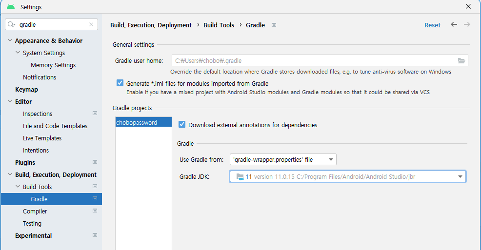 아래와 같이 Setting에서 Gradle JDK를 Java 11로 변경해주면 된다.